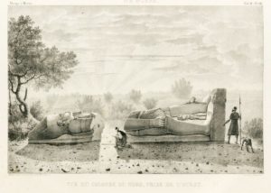 CAILLIAUD (Frédéric). Voyage à Méroé, au fleuve blanc, au-delà de Fàzoql dans le midi du Royaume de Sennar, à Syouah et dans les cinq autres oasis ; fait dans les années 1819, 1820, 1821 et 1822. Paris, De l'Imprimerie de Rignoux, 1823. 4 volumes in-8 de texte et un atlas in-folio en 2 parties, demi-cuir de Russie rouge avec coins, dos orné (Reliure de l'époque). Édition originale, ornée de 15 figures et planches dépliantes. L'atlas, divisé en deux parties, a été publié trois ans avant les 4 volumes de texte. Il est complet des 149 planches lithographiées (dont la carte générale à double page de l'Égypte et de la Nubie numérotée LIV-LV au tome II). Découpe de cachet dans le blanc des pages de titre. Cachet humide au verso de la dernière planche : Institut national agronomique. Quelques rousseurs. Reliure usagée avec taches sur le second plat et coins très accidentés.