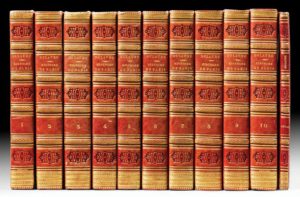 DULAURE (Jacques-Antoine). Histoire physique, civile et morale de Paris, depuis les premiers temps historiques jusqu'à nos jours. Seconde édition, considérablement augmentée en texte et en planches. Paris, Guillaume, 1823-1824. 10 volumes in-8 et un atlas grand in-8 oblong, demi-maroquin cerise avec coins, dos richement orné, non rogné (Simier R. du Roi). Seconde édition, en partie originale, ornée de 85 planches représentant des vues et des monuments de Paris. L'atlas comprend 7 grandes planches dépliantes : 5 plans de Paris et une grande carte routière des environs de la capitale, avec les limites ou les tracés en couleurs, le tout gravé sur cuivre par Berthe, et un plan du bois de Boulogne lithographié. Portrait de l'auteur, gravé par Dequevauviller d'après Morin, ajouté en tête du tome I. L'ouvrage de Dulaure, excellent historien et l'un des fondateurs de la Société des antiquaires de France, contient des descriptions précises et des anecdotes sur les rues et les monuments de Paris. Exemplaire dans une très élégante reliure signée de Simier. Des rousseurs claires et quelques brunissures. Petite déchirure sans manque à la pliure de certaines cartes. Petits manques de peau sur les plats du tome VIII, dos légèrement passés, frottements à la reliure de l'atlas.
