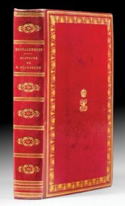 MONTALEMBERT (comte de). Histoire de sainte Élisabeth de Hongrie, duchesse de Thuringe (1207-1231). Paris, Bailly, Debécourt, 1836. Grand in-8, maroquin rouge à long grain, double filet gras et maigre et roulette dorée en encadrement, chiffre couronné doré au centre, dos lisse orné, doublure et gardes de moire bleue, tranches dorées (Reliure de l'époque). Édition originale, ornée de 3 planches gravées par A. Oleszczynski d'après Muller et Creuzer, dont une en frontispice, et un tableau dépliant. Exemplaire au chiffre de Marie-Louise (1791-1847), duchesse de Parme. Fille aînée de François d'Autriche, petite-nièce de l'ancienne reine Marie-Antoinette, Marie-Louise d'Autriche (1791-1847) épousa Napoléon Bonaparte en 1810 et fut impératrice des Français jusqu'en 1814. De leur union naquit Napoléon II, dit l'Aiglon, roi de Rome et duc de Reichstadt. Après les Cent-Jours et la chute de l'Empereur, elle se vit accorder par le Congrès de Vienne le duché de Parme où elle s'installa définitivement en mars 1816. Légères rousseurs. Petites traces noires sur les plats.