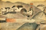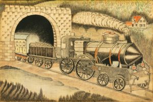 ALBUM DE DESSINS ORIGINAUX. S.l.n.d. [c. 1913-1915]. Album petit in-folio, demi-chagrin noir moderne. Album de 55 dessins originaux à l'encre et en couleurs, d'un style naïf, à pleine page au format oblong (environ 295 x 185 mm) sur des feuilles de cahier d'écolier, représentant des paysages, des villages, des hôtels, des maisons, des ponts, des caricatures, une voiture, une locomotive, etc. Les dessins semblent avoir été réalisés au moment de la première Guerre mondiale, comme le confirment certaines légendes datées 1913, 1914 ou 1915 : Le Bessat le 15 juin 1914, Souvenir de 1914-1915 le Kolossal 420 allemand aux Invalides le 15 juillet 1915, etc. Un dessin montre le Camp d'Holzminden en Allemagne et un autre Un poilu en sentinelle avancée surveille l'immense plaine d'où viennent de se dérouler de si furieux combats. L'atmosphère de cette période sombre se ressent dans beaucoup de ces dessins, que ce soit par les sujets représentés et par l'emploi majeur du noir et de couleurs foncées. Quelques dessins sont néanmoins coloriés dans des tons plus vifs. On ne sait pas exactement quel est l'auteur de ces dessins ni l'âge qu'il avait à l'époque : grâce à certaines légendes notées, on sait qu'il s'appelait Planchet et qu'il est né à Balbigny en Haute-Loire, près de Riotord. Fente ou déchirure sans manque réparées à l'adhésif à 2 dessins.