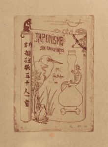 BUHOT (Félix). Japonisme. 1883. Suite de 10 gravures, sous chemise de papier brun. Suite complète de 10 eaux-fortes, représentant des objets japonais de la collection de Philippe Burty, exposés à la galerie Georges Petit, sous une chemise et une couverture ornées de deux gravures de la suite, l'une tirée en noir et en sanguine, l'autre en noir et en violet. Exemplaire numéroté 10. Petite déchirure à la pliure de la chemise.