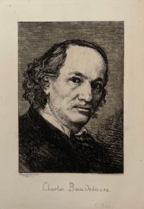 Le beau portrait de Baudelaire dessiné et gravé à l'eau-forte par Félix Bracquemond est en double état, avec le nom du poète en écriture cursive et en capitales d'imprimerie.
