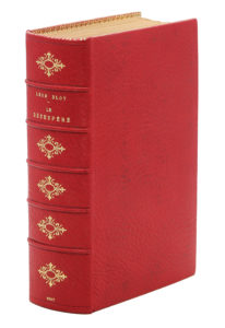 Paris, Tresse & Stock, 1887. In-12, maroquin rouge, dos orné de fleurons dorés, filets sur les coupes, dentelle intérieure dorée, tête dorée, non rogné, couverture et dos, chemise et étui gainés du même maroquin (C. de Séguier).Première édition imprimée du premier roman de Léon Bloy, désavouée par son auteur au profit de l'édition d'Alphonse Soirat et remisée jusqu'en 1893.