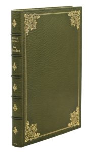 Paris, Alphonse Lemerre, 1912. Grand in-8, maroquin vert, double encadrement de filets dorés et à froid, entrelacs et fleurons dorés aux écoinçons, dos orné, double filet sur les coupes, doublure et gardes de veau-velours vert clair, tranches dorées sur témoins, couverture et dos, chemise et étui gainés du même maroquin (J. Faki – Berthaux doreur).Édition originale du dernier recueil poétique de Mistral.