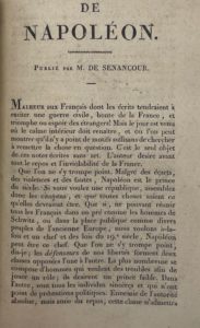 Ce texte publié par Senancour au début des Cent-Jours se veut une réplique mordante au pamphlet de Chateaubriand De Buonaparte et des Bourbons. Il y eut une seconde édition peu de temps après avec des changements.