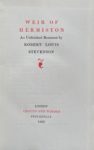 On joint, du même : Weir of Hermiston. Londres, Chatto & Windus, 1896. In-12, bradel percaline bleu nuit, tête dorée, non rogné (Reliure de l'éditeur). Édition originale. Catalogue de l'éditeur daté de mars 1896 in fine. Ex-libris manuscrit sur une garde.