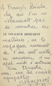 Envoi autographe signé de l'auteur à François Béalu (1932-2020), graveur, dessinateur et peintre, couvrant tout le faux-titre : À François Béalu, chez qui l'on ne s'étonnerait pas de rencontrer des martiens, ou le voyageur revenant de l'an cent mille, en souvenir d'une après-midi d'automne bien terrestre, avec ma très cordiale sympathie, R. Barjavel, 10-11-64.