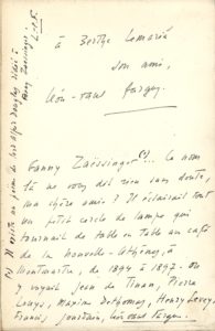 La dédicace est suivie de cette mention autographe, qui éclaire le chapitre Histoire de cette femme, ou les fous : « Fanny Zaëssinger... Ce nom là ne vous dit rien sans doute, ma chère amie ? Il éclairait tout un petit cercle de lampe qui tournait de table en table au café de la Nouvelle-Athènes, à Montmartre, de 1894 à 1897. On y voyait Jean de Tinan, Pierre Louys, Maxime Dethomas, Henry Levey, Francis Jourdain, Léon-Paul Fargue. » Une note inscrite à la verticale et paraphée précise : « Il existe un poëme de lord Alfred Douglas dédié à Fanny Zaëssinger. »