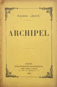 On joint une importante lettre autographe signée de l'auteur à son demi-frère Georges Louis sur Archipel (26 décembre 1905, 3 pp. in-12, enveloppe adressée), dont la première page est occupée par une table commentée des textes réunis dans le recueil. « [...] Tu vois la composition du volume. Les deux derniers numéros n'étant pas sérieux je les ai mis à la fin pour qu'ils ne nuisent pas aux précédents ; mais ils ne m'inquiètent pas du tout pour Landouzy [...]. Ne me demandez pas de supprimer un seul chapitre, essai, conte ou chronique, le volume est à peine assez gros pour paraître, et il faut que je l'aie remis vendredi matin pour toucher 4000 f. avec lesquels je vais régler 5.500 f. de traites et factures acceptées. Cette opération financière se fera par l'aide du St Esprit. / Le volume sera donc dédié tel qu'il est ou non dédié. Peux-tu m'envoyer un petit bleu pour me dire si cet "archipel" de contes et chroniques est dédiable à ton ami ? [...] En principe, la dédicace faite certainem[en]t plaisir à Landouzy ; il n'y a qu'à voir quels livres il expose dans son salon pour s'en convaincre. – Seulement, il ne faudrait pas tomber à faux. »