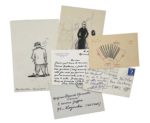– une carte de vœux autographe signée de Jean-Pierre Chabrol à Pierre Mac Orlan (1958) ornée d'un croquis original représentant un accordéoniste ;