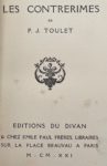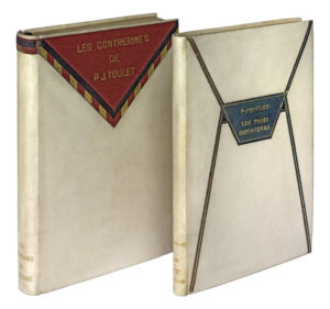 Paris, Éditions du Divan et Émile-Paul frères, 1921. In-16, vélin blanc, triangle de maroquin rouge mosaïqué en tête du premier plat titré à l'or et serti de deux listels se poursuivant en haut du dos et du second plat, l'un en maroquin noir, l'autre en maroquin rouge ponctué de losanges dorés, dos lisse, doublure de papier rose irisé de doré bordée d'un listel de maroquin noir, tête dorée, non rogné, couverture et dos, étui (Y. Ollivier – G. de Léotard).Édition originale du chef-d'œuvre poétique de Paul-Jean Toulet. Élaboré dès 1913, à l’instigation de Francis Carco, ce recueil ne fut publié qu’à titre posthume, en décembre 1920, par l'entremise d'Henri Martineau.