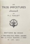 On joint, du même : Les Trois impostures. Almanach. Paris, Éditions du Divan et Émile-Paul frères, 1922. In-16, vélin blanc, pièce de titre de maroquin vert au centre du premier plat d'où partent quatre fins listels mosaïqués et dorés reliés aux angles, décor similaire au second plat, dos lisse, filet intérieur doré, tête dorée, non rogné, couverture et dos, étui (Y. Ollivier – G. de Léotard). Édition originale. Un des 20 exemplaires de tête sur chine. Élégante reliure Art Déco réalisée par Yvonne Ollivier et Geneviève de Léotard. Minimes rousseurs sur les tranches.