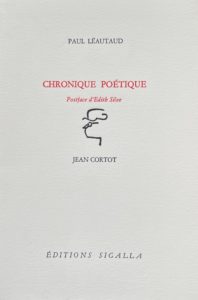 Chronique poétique. Postface d’Édith Silve. Jean Cortot. Paris, Sigalla, 2004. Plaquette in-8, en feuilles, sous couverture rempliée. Édition originale. Un des 50 exemplaires de tête sur hollande. Lithographie signée et justifiée par l’artiste.