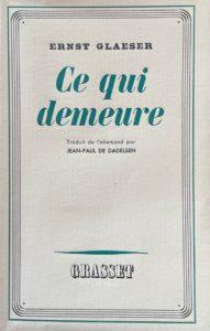 GLAESER (Ernst). Ce qui demeure. Paris, Grasset, 1938. In-12, broché, non coupé. Édition originale de la traduction de Jean-Paul de Dadelsen. Exemplaire de tête sur alfa non numéroté.