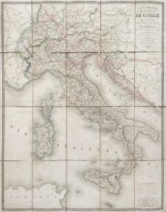 Paris, Charles Picquet, 1830. 83 x 67 cm. Carte gravée aux liserés coloriés, divisée en 20 sections, entoilée et repliée dans un étui en papier marbré du XIXe siècle. Belle carte de l'Italie, représentant aussi la Suisse, les côtes de l'Adriatique, etc., gravée par Richard Wahl d'après Picquet fils.