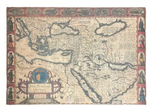 Georges Humble, [1627]. 39 x 51 cm. Carte gravée en coloris de l'époque, cadre moderne en bois doré. Magnifique carte anglaise de l'Empire ottoman, s'ouvrant à l'ouest depuis l'Italie, la Grèce, traversant le Moyen-Orient par la péninsule arabique jusqu'au frontières russes, tartares et perses. On peut y observer la mer Méditerranée, Noire, Caspienne, ou encore la mer Rouge.