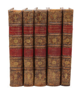 Genève, Jean-Léonard Pellet, 1780. 5 volumes in-4, veau porphyre, triple filet doré, dos orné, dentelle intérieure, tranches dorées (Reliure de l'époque).Troisième et meilleure édition, en partie originale, du chef-d'œuvre de l'abbé Raynal.