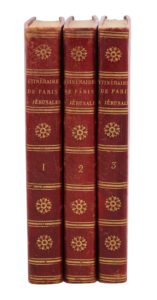 Paris, Le Normant, 1811. 3 volumes in-8, demi-basane maroquinée rouge avec coins, dos lisse orné, tranches lisses (Reliure de l'époque).Seconde édition, conforme à l'originale parue la même année et illustrée, comme elle, d'une grande carte dépliante et d'un fac-similé en arabe. Le dernier volume est complet du catalogue de l'éditeur.