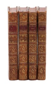 Paris, Saugrain & Hochereau, 1724. 4 volumes in-12, veau fauve, dos orné, tranches rouges (Reliure de l'époque).Première édition in-12, comprenant la même illustration que l'édition in-4 publiée simultanément : un frontispice allégorique, une carte de l'Amérique repliée et 41 figures hors texte d'ethnologie.