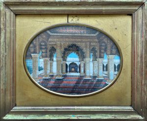 MINIATURE — Vue intérieure du Diwan-I Khas dans le Red Fort de Delhi. Pigments polychromes et or sur ivoire, dans un cadre en bois doré. Inde, XIXe siècle. 8,5 x 11,5 cm, cadre 14,2 x 17 cm.