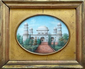 MINIATURE — Le Mausolée d'I'timad-ud-Daulah à Agra. Pigments polychromes et or sur ivoire, dans un cadre en bois doré. Inde, XIXe siècle. 8 x 10,8 cm (à vue), cadre 14 x 17 cm.