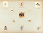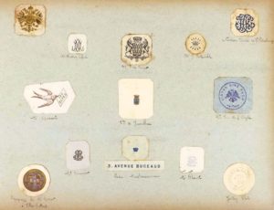 ALBUM DE MONOGRAMMES. In-8 oblong, demi-chagrin noir à coins, dos à nerfs. Ensemble de 167 monogrammes et blasons contrecollés et légendés au crayon (Duc d'Orléans, Comte de Sudre, Baron Finot…), répartis sur 17 pages cartonnées. Reliure frottée.