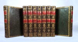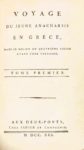 BARTHELEMY. VOYAGE DU JEUNE ANACHARSIS EN GRECE. Paris, Sanson, 1791. 9 volumes in-8, maroquin vert, roulettes dorées sur les plats, dos lisse orné de lyres et de vases dorés, tranches dorées (reliure de l'époque). Exemplaire joliment relié. Quelques défauts sans gravité, très rares rousseurs. Exemplaire sans l'atlas.