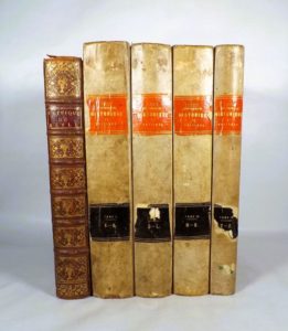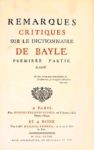 BAYLE (Pierre).DICTIONNAIRE HISTORIQUE ET CRITIQUE. Troisième édition revue, corrigée et augmentée par l'auteur. Rotterdam chez Michel Bohm, 1720. 4 volumes in folio, demi velin (reliure du XIX°). Quelques défauts aux reliures, rousseurs éparses, cernes clairs. Exemplaire non rogné. On joint: - [JOLY]. Remarques critiques sur le dictionnaire de Bayle. Paris, Guerin, 1748. 2 parties en un volume in-folio, veau marbré, dos à nerfs orné, (reliure de l'époque). Bon exemplaire. ENSEMBLE 5 VOLUMES.