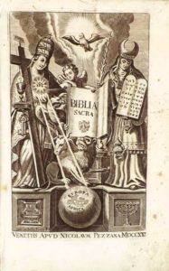 BIBLIA SACRA.Vulgatae editionis… Venise, Nicolaum Pezzana, 1720. Fort in-4° de [24]-998-[52] pages, velin ivoire (reliure de l'époque). Bible latine ornée d'un titre gravé sur cuivre et de très nombreux bois dans le texte encore marqués par le style Renaissance. Texte sur 2 colonnes. Piqûres éparses.
