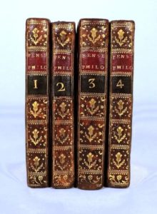 BOUDIER DE VELLERMET (P.J.). PENSEES PHILOSOPHIQUES, sur la nature, l'homme, et la religion. Paris, Royer, 1784-86. 4 vol. in-18, basane marbrée, dos lisse orné, tranches jaspées (reliure de l'époque). Edition originale. Ces«Pensées» sont conçues pour s'opposer à celles de Diderot et n'ont été écrite « que pour les esprits chancelants dans la foi » et « non pour nos incrédules, sourds, volontaires, qui ne veulent rien entendre ». Bon exemplaire (Barbier III, 827).