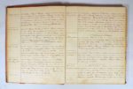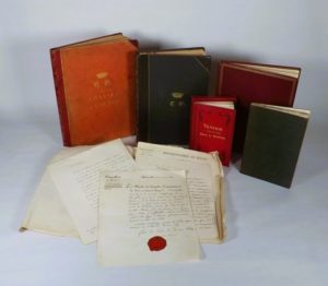 [CHASSE A COURRE] - GREFFULHE (Comte de). 5 LIVRES ET CARNETS, tous écrits très lisiblement par le comte Henri de Greffulhe (1848-1932). 1. Carnet in-12, chagrin rouge, plats orné à froid, nom doré et titre vénerie sur le plats, étui. - Liste des chiens avec leurs noms. 6 pages manuscrites, plusieurs blanches ou arrachées. 2. In-8 d'environ 100 pages, demi veau vert à coins, dos lisse orné de fers rocailles, initiales dorées sur le plat. - Etat des lièvres, du gibier tué et donné, chats et putois, renards, liste des gardes de 1854 à 1866,... du domaine de chasse de Bois-Boudran. 3. In-4° d'environ 200 pages, demi mar. rouge, dos très orné, initiales couronnées H.G. sur mle 1er plat, avec la mention chasse à courre. - Jourrnal couvrant la période 1837 à 1877. On trouve les noms des participants: Comte et comtesse de Paris, A. de Grammont, Vcte de Fitz-James, etc..., les lieux des rendez-vous, le temps passé à la poursuite des loups ou des cerfs avec force détails. On joint 6 pièces administratives concernant le Majorat de Greffulhe. 4. In-4° de 55 pages, maroquin grenat, filets dorés, tr. dorées (Martin rel.). - Relation d'un séjour de convalescent en Suisse intitulée «Mon premier voyage». 1868. 5. Carnet in-12 d'environ 60 pages, moleskine verte. - Relation d'un voyage avec son frère et casimir Perier dans l'île de Wight et sur la cote anglaise. 1844. Ensemble en bonne condition.