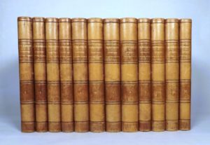 CHATEAUBRIAND (François-René de). MEMOIRES D'OUTRE-TOMBE. Paris, Eugène et Victor Penaud, 1849-1850. 12 volumes in-8, demi-basane, dos lisse orné de filets (reliure de l'époque). Edition originale de l'un des textes les plus importants de la littérature française. Chateaubriand était mort le 4 juillet 1848; Ayant «hypothéqué» son tombeau par la vente de ses mémoires à une société anonyme moyennant une rente viagère de 12.000 francs, la presse les publia en feuilleton. Les frères Penaud commencèrent leur édition qui, seule est l'originale, en janvier 1849 et la terminèrent en octobre 1850. Exemplaire bien complet de la Liste des souscripteurs, de la Lettre de Chateaubriand à H.L. Delloye, de l'avant-propos et présentant l'erreur de pagination au tome 2. Rousseurs éparses, parfois prononcées, tache d'encre marginale sur 2 feuillets, petites usures aux reliures, les dos sont uniformément passés. Ex-libris René Etienne. (Escoffier n° 1833) (Clouzot, p. 66).