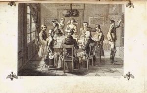 FORTIS DE PILES (A.) et SAINT-CHARLES (G)].- MOUCHERON (C.A.). OMNIANA, ou extrait des Archives de la Société universelle des gobe-mouches. Paris, Maradan, 1808, 1 volume in-12 de [4]-16-424 pages, demi-veau blond (reliure de l'époque). Seule édition ornée d'un curieux frontispice gravé par Mariage, représentant un dîner de la Société des gobe-mouches (Aude, Biblio des Ana, 77). Exemplaire défraîchi.