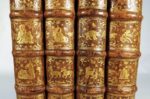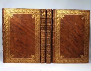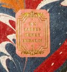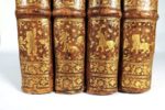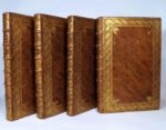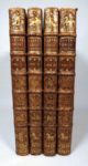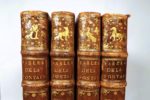 LA FONTAINE. FABLES CHOISIES, mises en vers par J. de la Fontaine. Paris, chez Desaint, Saillant et Durand, 1755-59. 4 volumes in folio, veau fauve, dos ornés de fers spéciaux dorés, illustrant des fables, plats décorés d'une dentelle avec fers spéciaux aux angles, dentelle intérieure, tr. dorées (reliure ancienne). EXEMPLAIRE BERALDI avec son ex libris et décrit sous le n° 134 de son catalogue «livres illustrés du XVIII°, 1934». Il est illustré d'un frontispice par Oudry, gravé par Cochin et 275 figures dessinées par Oudry, gravées par l'élite des artistes de cette époque, et de très beaux culs-de-lampe gravés sur bois par Lesueur. EXEMPLAIRE DE PREMIER TIRAGE, sur moyen papier de Hollande, avec la figure pour le Singe et le Léopard, avant la légende sur la banderole, on y a joint le portrait de Cochin gravé par Largillière. Belle reliure en veau ancien, ornée sur le dos des fers spéciaux dessinés par Louis Douceur, relieur du Roi et inspirés des fables: Le corbeau et le renard, le renard et la cigogne, le lion et le moucheron, le loup et l'agneau, etc… Les plats sont décorés de la dentelle dite DENTELLE DU LOUVRE avec, dans chaque angle, l'un des fers spéciaux qui ornent le dos.