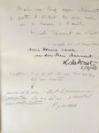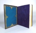 LIVRE D'OR DE L'ADRET A VILLARS DE LANS.1 volume in-4°, maroquin bleu marine, large et riche encadrement avec filets dorés sur les plats, dos lisse orné de listels crèmes en long avec motifs dorés, doublure de maroquin bleu canard, encadrement de filets et pointillés dorés soulignés d'un listel de maroquin rouge, larges motifs dorés, gardes de moire lavande, tranches dorées (reliure vers 1925). Magnifique reliure estampée Maquet à Nice, la plus luxueuse maroquinerie de l'époque fondée en 1841, fournisseur de l'Impératrice Eugénie. Ce livre d'or avait été commandé par Pierre Chabert qui avait transformé en partie un ancien préventorium (1927) en hôtel de luxe appelé l'Adret (pour évoquer le versant exposé au soleil). Les 10 premiers feuillets sont remplis d'hommages manuscrits signés de personnalités, écrivains, politiques,... Le Prince Achille Murat, le Prince Sixte de Bourbon, Pierre Brisson, du Figaro, le directeur des guides bleus, l'ambassadeur de France à Rome, le New-York Hérald Tribune, etc... Petit accroc à la coiffe inférieure.