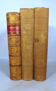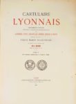 [LYON] - GUIGUE (M.C.).CARTULAIRE LYONNAIS. Documents inédits pour servir à l'histoire des anciennes provinces de Lyonnais, Forez, Beaujolais, Dombes, Bresse et Bugey, comprises jadis dans le "Pagus major lugdunensis". Lyon, Association typographique, 1885-1893. 2 volumes grand in-4°, cartonnage de l'éditeur. Tome I : Documents antérieurs à l'année 1255. Tome II. Documents de l'année 1255 à l'année 1300. Tampons. Edition originale. On joint: - COMMARMOND (A). Description des antiquités et objets d'art contenus dans les salles du Palais-Des-Arts de Lyon. Lyon, Dumoulin, 1855-57. Gr. in-4°, demi-veau sable (rel. de l'époque). ENSEMBLE 3 VOLUMES.