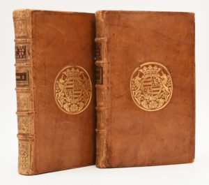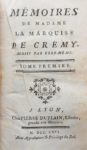 MIREMONT (Anne d'Aubourg de la Bove, comtesse de). MEMOIRES DE MADAME LA MARQUISE DE CREMY, écrits par elle-même. Lyon, Duplain, 1766. 2 volumes in-12 de [2]- 416 (mal chiffr. 418) et (2]-462-[2] pages, veau blond, armes dorées sur les plats, dos à nerfs orné (reliure de l'époque). Madame de Crémy est une jeune personne qui vit dans le monde sous l'autorité d'une mère frivole et volage, et qui n'a que son plaisir en tête. Edition originale non citée par Gay. Charnières craquelées, titre froissé. EXEMPLAIRE AUX ARMES DE LOUIS-HILAIRE DU BOUCHET (1716-1788), Comte de Sourches, capitaine de dragons au régiment de Languedoc et chevalier de Saint-Louis.