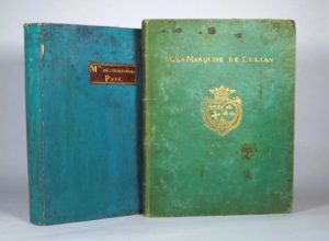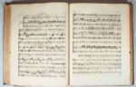 (MUSIQUE).JOURNAL DE HARPE par les meilleurs maitres. Paris, chez Leduc, sans date (vers 1795). Environ 130 livraisons hebdomadaires (5èmeà 15 année) de 2 ou 3 pages de musique avec paroles, reliées en 2 volumes in-4°, velin vert, plats ornés, tranches rouges (reliure de l'époque). Quelques partitions manuscrites et journal d'airs choisis avec accompagnement de Harpe intercalés. Un volume porte les armes et le nom de la Marquise de Cullan, l'autre celui de Madame de Courtarvel Pezé. Mouillures sur plusieurs pages.