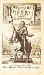 PEREFIXE (Hardouin de).HISTOIRE DU ROY HENRY LE GRAND. Reveuë, corrigée, et augmentée par l'auteur. Amsterdam, Daniel Elsevier, 1678. Petit in-12, velin rigide à recouvrement (reliure de l'époque). Titre gravé daté de 1679. Très bon exemplaire (Willems, 1551).
