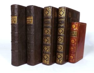 SAINT AUGUSTIN. LES CONFESSIONS. Paris, chez Martin, 1741. 2 vol. in-8, galuchat noir, dentelles à froid sur les plats, dos à nerfs orné de fleurs de lys à froid, tranches dorées (reliure de l'époque). Traduction française de Dom Jacques Martin, bénédictin, avec le texte latin en regard. Bel exemplaire. On joint: - OFFICE DE LA SEMAINE SAINTE, traduit en français. Office du matin - Office du soir. Paris, Léonard, 1672. 2 vol. in-8, maroquin noir, plats ornés à la Du Seuil, dos à nerfs ornés avec une fleur de lys couronnée en queue, tranches dorées (reliure de l'époque). Annotations manuscrites «à l'usage de Samuel Le Roy». Bon exemplaire. - LA JOURNEE DU CHRETIEN. Avignon, Grégoire, 1773. In-12, maroquin grenat, filets dorés sur les plats, dos à nerfs orné de grandes fleurs dorées, tranches dorées (reliure de l'époque). Nouvelle édition dédiée à Madame de France. Bon exemplaire. ENSEMBLE DE 5 VOLUMES.
