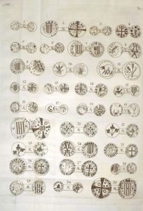 SALAT (Josef). TRATADO DE LAS MONEDAS LABRADAS EN EL PRINCIPADO DE CATALUNA, con instrumentos justificativos.Barcelona, Antonio Brusi, 1818. 2 tomes en 1 volume in-4°, demi chagrin anthracite (reliure de l'époque). Traité de numismatique catalane illustré de 8 planches, dont 7 de monnaies et une qui représente la généalogie des Comtes de Barcelone. Cernes sombres en haut des feuillets. On joint: - GORDON (Thomas). Description of ancient coins from the cabinet of Th. Gordon. 14 planches de monnaies avec les descriptions. In-4°, cart. d'époque. ENSEMBLE 2 VOLUMES.