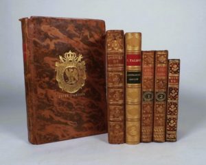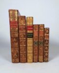 THOMPSON (J.). Les Saisons, poëme traduit de l'anglois de Thompson. Paris, Pissot, Nyon, 1779. In-8, basane marbré, palmarès doré sur le premier plats, dos lisse orné, tr. marbrées (reliure de l'époque). Titre gravé et de 4 figures hors-texte d'après Eisen. Une coiffe manquante. Ex-libris de la bibliothèque du Vicomte Pelleport Burète, Baron d'Empire. On joint: - BERNARD. OEUVRES. Londres, s.n. (Cazin), 1777. In-16, basane marbrée, dos lisse orné, tr. rouges (rel. de l'époque). Frontispice de Marillier, gravé par Launay. Vers manuscrit sur la garde. Cernes clairs en marge - LETTRES ET EPITRES AMOUREUSES d'Héloïse et d'Abeilard. S.l., au Paraclet, 1800. 2 vol. petit in-12, basane marbrée, dos lisse orné (rel. de l'époque). 2 portraits. - MALHERBE. POESIES. Paris, Barbou, 1764. In-12, veau tacheté, dos à nerfs orné, tr. rouges (rel. de l'époque). Portrait en frontispice. Ex-libris Feunette. - TALBOT (E.). HISTOIRE DE LA LITTERATURE GRECQUE. Paris, Lemerre, 1881. In-12, demi-veau ocre, dos à nerfs orné, tête rouge (rel. de l'époque). Rousseurs. ENSEMBLE 6 VOLUMES.