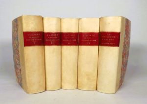 URFE (Honoré d').L'ASTREE ou par plusieurs histoires, et sous personnes de bergers, et d'autres, sont déduits les divers effets de l'honneste amitié. Revue et corrigée en cette dernière édition et enrichie de figures en taille-douce. Paris, 1621-38. 5 volumes in-8, demi-velin à coins (reliure du XIX°). Réunion composite de plusieurs éditions, reliées à l'identique. - Tome 1. Paris, Courbé. 1633. [16]-880-[6] pages. Titre gravé - 2 portraits - 12 gravures. - Tome 2. Paris, du Bray, 1621. [16]-890 pages (parfois mal chiffr.). Titre gravé - 2 portraits. - Tome 3. Paris, Société des imprimeurs (s.d.) [16]-975 pages (mal chiffr.). Titre gravé - 1 portrait. - Tome 4. Paris, Société des imprimeurs (s.d.) [16]-1127 pages. Titre gravé - 2 portraits. - Tome 5. Paris, Pomeray, 1630. [28]-985-[3] pages. Titre gravé - 3 portraits. Petites déchirures avec perte de quelques lettres sur 3 feuillets, petite galerie sur plusieurs feuillets et cernes clairs.