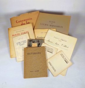 BRUKER (Marcel). ÉLOGE DE LUCIEN MAINSSIEUX. P., Marcel Bruker, 1950. In-4°, en feuilles. 11 gravures originales de L. Mainssieux, dont 1 frontispice en couleurs. Ex. num. sur Rives. On joint: - CARROLL (L). FANTASMAGORIE. P., s.n., 1939. In-8 br.. - CARCO (F.). AVEC LES FILLES. P., s.n., 1924. In-8 br., étui. Facsimilé du manuscrit original. Ex. num. et signé par Carco. - LINDON. HISTOIRE SAVOUREUSE du parc à huîtres d'Etretat. P., éd. de Minuit, 1955. In-12 br.. - MAAST. SEPT CAUSES CELEBRES. P., Fontaine, 1946. In-12 broché. Ex. num. sur velin. - VALERY. HUYSMANS. P., La Jeune Parque, 1927. In-8 broché. Eau-forte de Jouas. Ex. num. sur Rives. - BERTRAND (H.). «PARLER AVEC LES ABIMES». P., cahiers de «Direction», 1932. In-12 br. Images de G. Lebrun -Rodenbach - ISRAEL (M.).«CREVASSES». ». P., cahiers de «Direction», 1933. In-12 br. Images de R. Gid. - PERET (B). MAIN FORTE. P., éd. De la Revue Fontaine, 1946. In-4° br. Ill. de Victor Brauner. - PERTUS (E.) - FILIPPI (A). LOU CANSOUNIE DE LA TARGO. 6 cansoun. S.l., s.n, 1937. In-4°, en feuilles.6 gravures couleurs hors-texte. Ex. num. sur Auvergne. ENSEMBLE 10 VOLUMES.