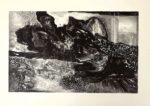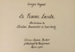 HUGNET (G). LA FEMME FACILE. Paris, Jeanne Bucher, 1942. In-12 oblong en feuilles, couverture rempliée rouge ornée d'un découpage contrecollé sur le premier plat (différent pour chaque exemplaire). Edition originale ornée d'un frontispice et de 15 compositions en noir de Christine Boumeester et d'Henri Goetz. L'ouvrage est entièrement lithographié et n'a été tiré qu'à 110 exemplaires numérotés, ici l'un des 100 sur Arches. Petites usures.
