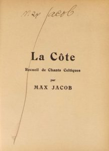JACOB (Max). LA COTE. Recueil de chants celtiques anciens inédits. Texte breton revu par M. Julien Tanguy. Paris, Birault, pour l'auteur, 1911. In-8 broché, partiellement non coupé. EDITION ORIGINALE non justifiée et ornée d'un dessin de l'auteur à pleine page. Bel exemplaire tel que paru et enrichi de la signature manuscrite de l'artiste sur le titre.