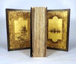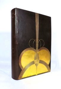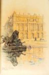 RÉGNIER (Henri de). LA CITE DES EAUX. Paris, Blaizot et Kieffer, 1912. Grand in-8, maroquin bronze, plats décorés d'une large composition dorée dessinant une fontaine stylisée, tête dorée, filets dorés intérieurs, eau-forte sur soie à chaque contreplat, gardes de moire perle, doubles gardes, couverture et dos, étui (René Kieffer). Bel hommage à Versailles illustré de 39 eaux-fortes hors-texte de Charles Jouas. Le texte et les gravures sont placés dans de beaux encadrements tirés en bistre. Tirage à 260 exemplaires, celui-ci exemplaire d'artiste signé par Kieffer avec un dessin original en couleurs et 3 états des eaux-fortes. Bel exemplaire. (Monod, 9535).