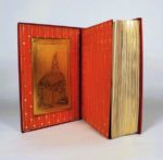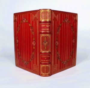 SAMAIN (Albert). CONTES. Paris, chez l'artiste, 16 rue Cassini, 1926. Grand volume in-8, maroquin rubis, plats décorés de filets dorés verticaux et d'une guirlande de roses mosaïquées dans un encadrement à motifs géométriques, dos à nerfs orné du même décor, doublure de maroquin mandarine ornée d'un décor vertical formé de filets et de losanges dorés, double garde, cuivre original enchâssé dans le premier plat, tranches dorées sur témoins, couvertures et dos, étui bordé (H. Blanchetière, 5 Avril 1927). Xanthis - Divine Bontemps - Hyalis - Rovère et Angisèle. Ces 4 contes sont illustrés de 25 compositions gravées à l'eau forte en couleurs par Sylvain Sauvage. Tirage à 271 exemplaires seulement, celui-ci exemplaire de collaborateur sur Wathman signé par l'illustrateur et enrichi d'une planche originale et de plusieurs suites des illustrations (3 ou 4 états, décomposition des couleurs, en noir, en bistre). Un mors fendillé sinon superbe exemplaire en reliure mosaïquée et doublée de Blanchetière.