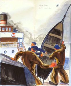 VERCEL (Roger). AU LARGE D'EDEN. Paris, Editions Arc-En-Ciel, 1945. In-4° en feuilles sous chemise et étui de l'éditeur. 39 illustrations couleurs in texte d'après Yves Creston rehaussées au pochoir à l'aquarelle. L'un des 38 exemplaires sur chiffon de Lana enrichis d'une suite en un ton et d'une très grande aquarelle originale «Les Doris amenés à bord» (50 x 60 cms) signée. Bon exemplaire.