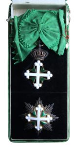 ORDRE DES SAINTS-MAURICE-ET-LAZARE. – — Plaque et bijou de grand-croix (métaux et émail), avec écharpe complète et étui de velours vert au monogramme royal « VE » couronné et au nom du joaillier Domenico Cravanzola à Rome.